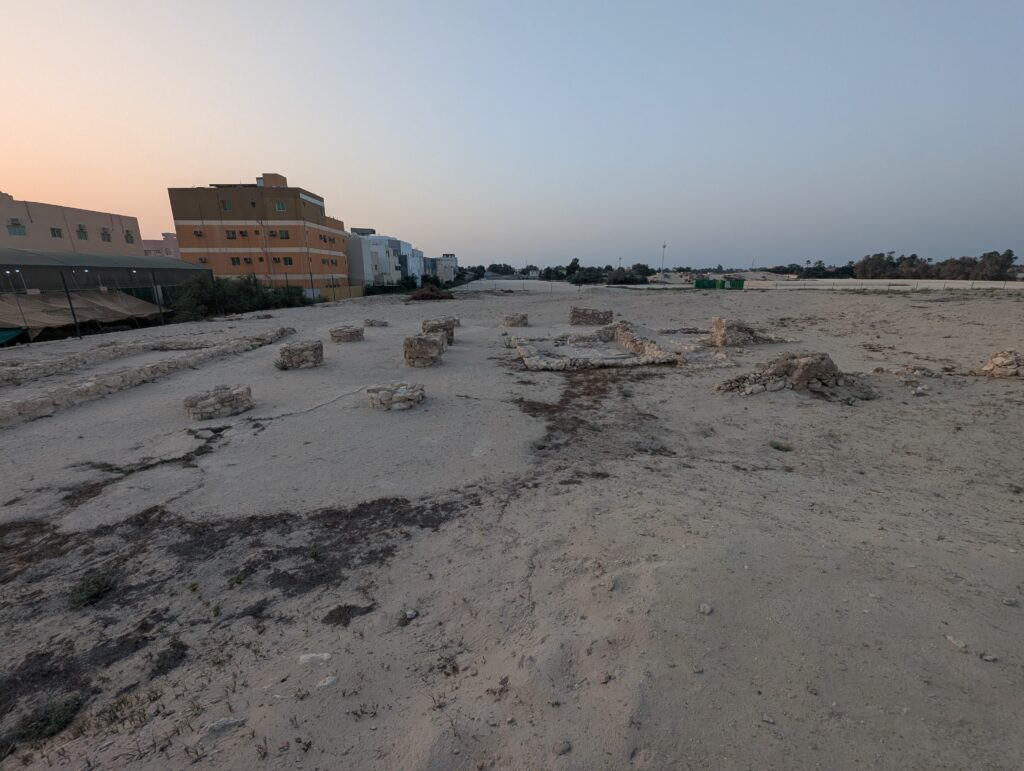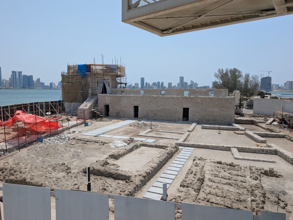 At the seaside end of the Pearling Path, there is a fort and a visitor center. It is assumed tourists will begin by the seaside and work inland, opposite of my route. The visitor center was an air conditioned building with very little interpretive material inside. There were protected ruins of a very old warehouse on the adjacent property, however. The fort near this end was called Qalat Bu Mahir. There was a small museum located there as well, but the fort was otherwise closed for renovations.
