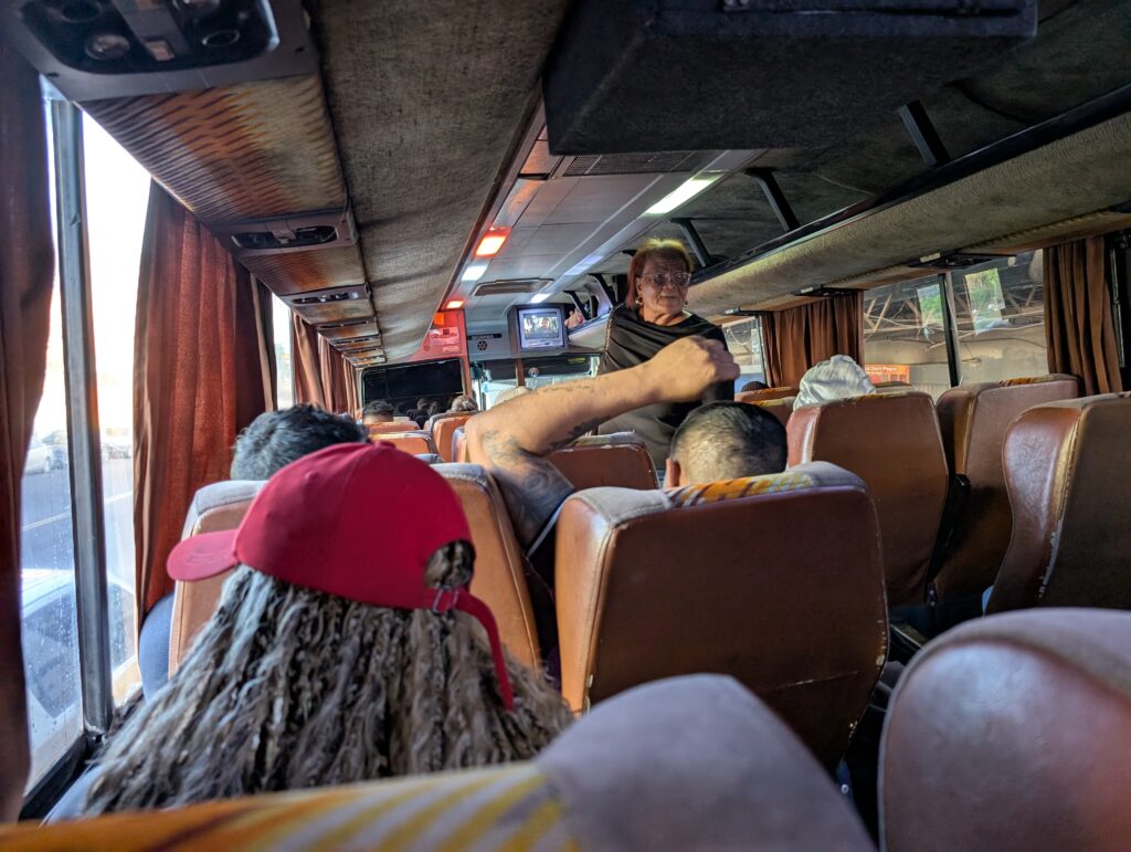 My hosts recommended the “pulpo” which was octopus! I may not have ordered that on my own, but it was especially tasty over the coconut rice it came with. I was also given a salad and some fried plantains. It was a tasty meal. I walked a few hundred meters back to a much more salty-looking bus terminal than Albrook in Panama City. I walked right up to a bus with a crier shouting, “Panama, Panama!” Within ten minutes, we were underway on a one hour trip back to Panama City.