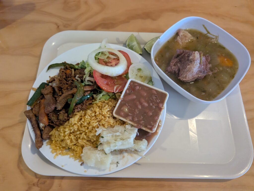 By noon, I was done and a little bit hungry. I decided I would attempt to mail Andrew’s postcards and my postcard. One shop in the old town neighborhood had a 4-72 box (4-72 is Colombia’s postal service). The shop wanted to up charge me for the stamps, though. I wanted to get out of the tourist area to eat lunch anyway, so I hopped a bus toward the main city post office a few miles away. It was closed until 2 p.m. for siesta or lunch or something, so I went to the nearby Restaurante dos Techos for lunch. I was finally able to try sobrebarriga. Turns out, this is pretty much just churrasco from a slightly different meat cut. Mine came even came with the same sauce. It was served with platacon and a small salad as well. Like many Latin American steaks, this was think and a bit tough, but not too much, and the flavor was very good.