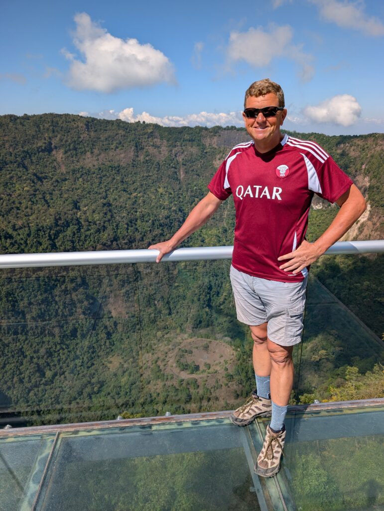 The crater itself isn’t spectacular in terms of features, but the size is impressive. The crater has a diameter of almost a mile and is over 1,500 feet deep. There is a small coffee shop along the trail, along with several viewing platforms. One of the platforms is glass and allows you to step out over a steep drop-off. As I was taking a few shots from the glass platform, I visited with some Chinese speaking tourists from Singapore who were kind enough to take a picture of me, posing there on the volcano’s rim. We talked about Singapore, the caning incident, and Joseph Schooling for a few minutes, and then went our separate ways. For more information on Singapore, and those subjects, follow the link to the Singapore page from the summer of 2024.