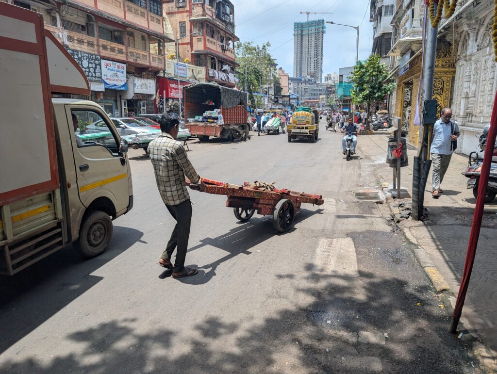 There was no good means of taking buses from the Jain temple to my next stop, so I just walked to Dhobi Ghat. Dhobi Ghat is purportedly the world’s largest outdoor laundry. The walk to Dhobi Ghat was over two miles and led through the what appeared to be a Muslim Quarter. There were several mosques, and the majority of people walking about were wearing Islamic garb. There were many hijabs and burkas, and many of the flat topped, cylindrical caps resembling the ones Caleb and I bought in Oman. There were quite a few men pulling long hand carts, loaded with delivery materials. The traffic on the city streets was as packed and chaotic as always. I decided when I needed to cross streets or pass through intersections, I would allow one of these hand carts to run interference for me. They were about 15-20 feet long, so it worked quite well. The only problem was that I had to keep up with them. They were on the move! Those little fellows loaded up with burdens were walking fast enough that it was quite difficult for me to keep up, even just carrying my camera bag.