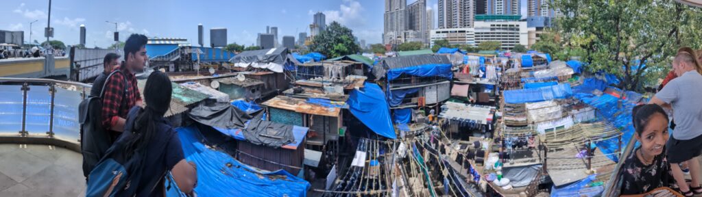 As you might expect, it didn’t take all that long to visit Dhobi Ghat. It is just an outdoor laundry, albeit a very big one. There is a viewing platform, and I sat there watching families work together to ply their trade as babies cried around them, and as younger, non working family members looked on or sought entertainment in simple forms. One man held a baby as he worked. Everything was hung out to dry. Word is out that this is on the tourist agenda, so quite a few Mumbaiker vendors hover around the platform selling souvenirs and other kitsch. I was getting hungry after I stopped here, so I dropped into a cafeteria type restaurant and grabbed an inexpensive meal – either a biryani or something like it.