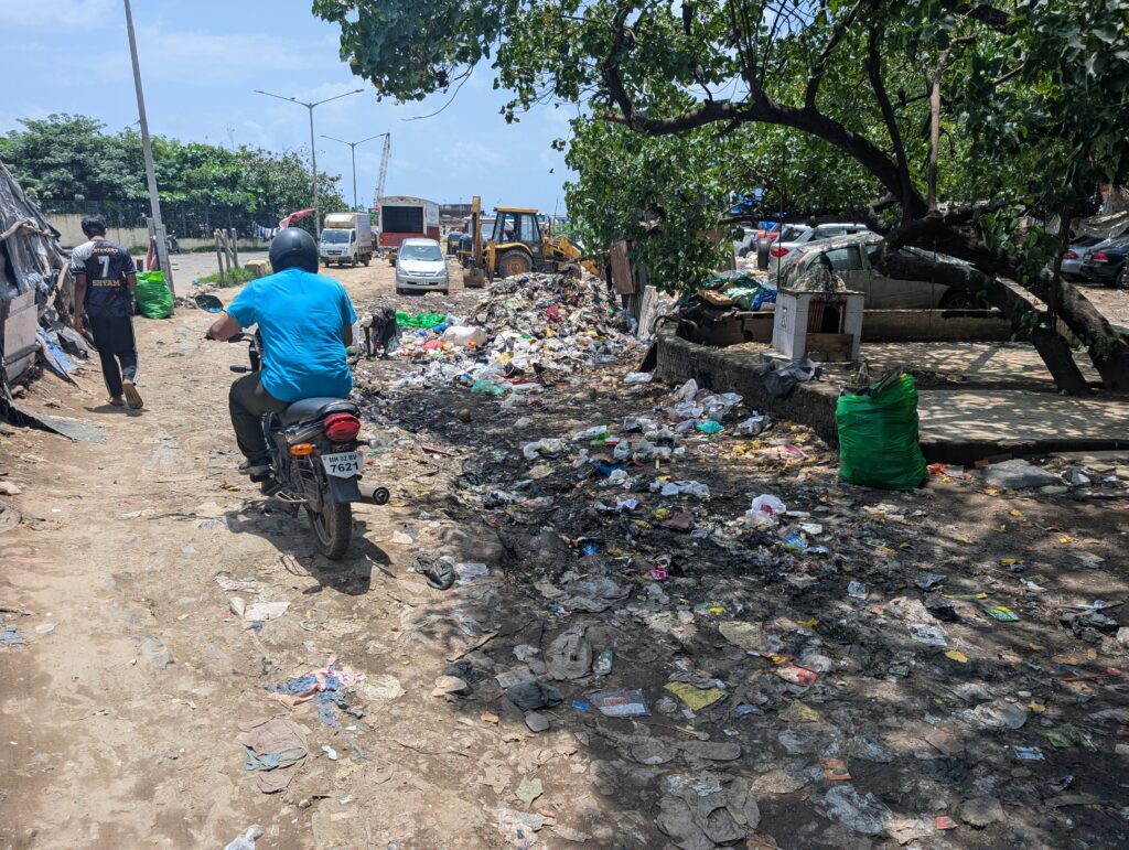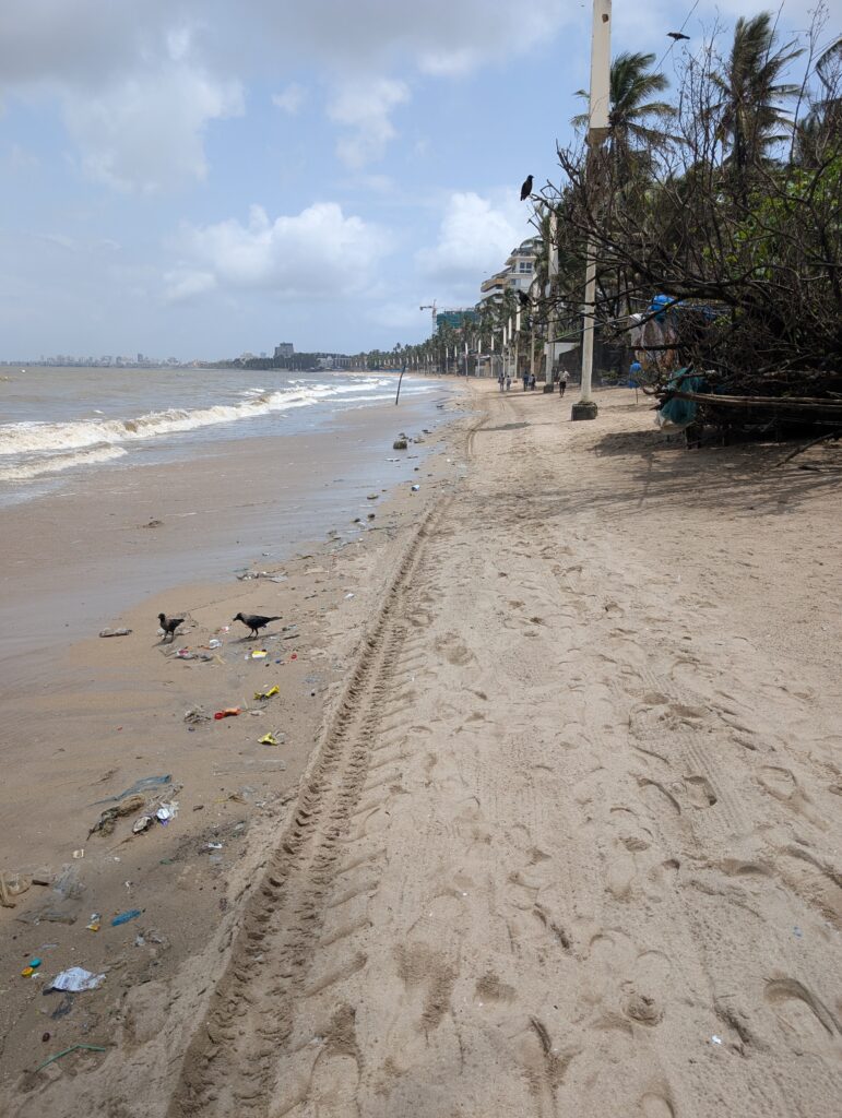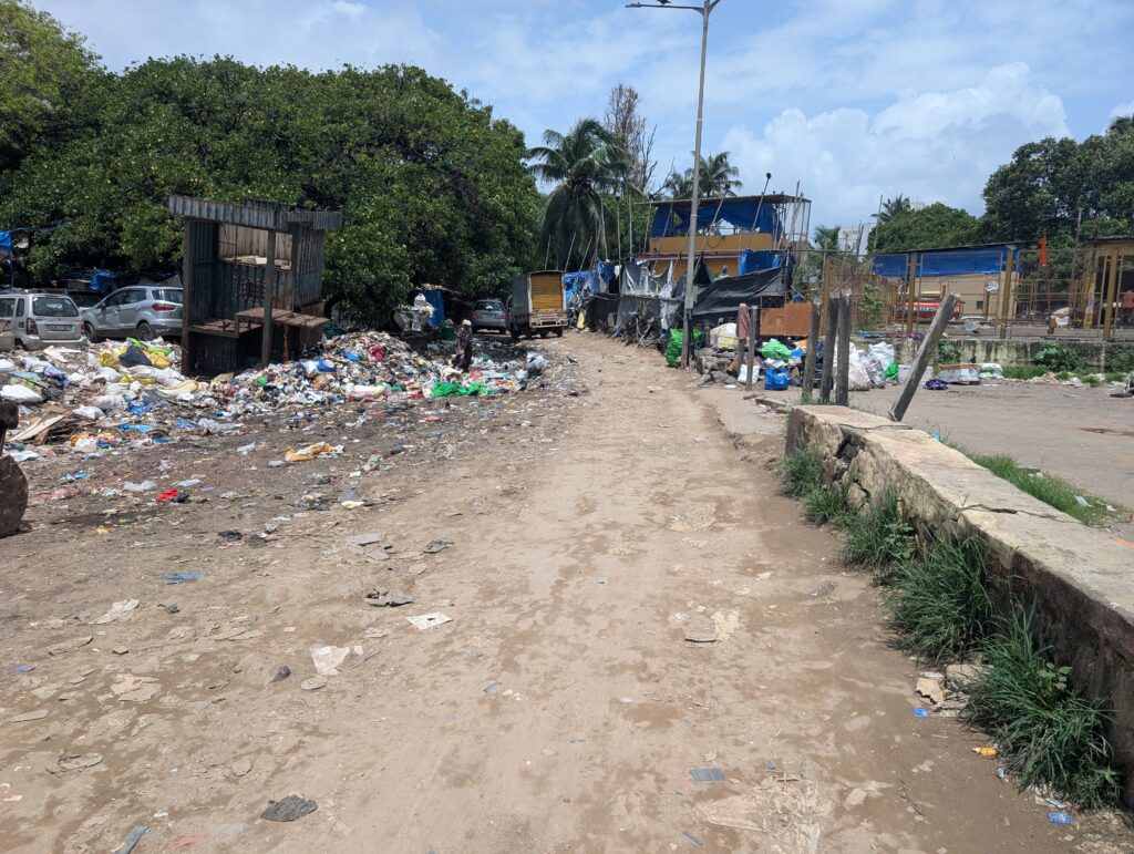 Beyond the bridge lay a wide, open area that looked like it washed out from time to time. You could see the ocean in the distance, along with construction rigs and the occasional apparently abandoned rickshaw here and there. After a few hundred yards, I entered what was unquestionably the Juhu city dump. There were stacked trash bags everywhere. I would have wondered if I was off of the path. I was following the Google Maps directions, though, and there was a steady stream of rickshaw and motorbike traffic joining me from this point. The path through the trash dump seemed well worn. There is trash here and there all over India, but this was definitely a place where it had been collected and brought. There was that much.