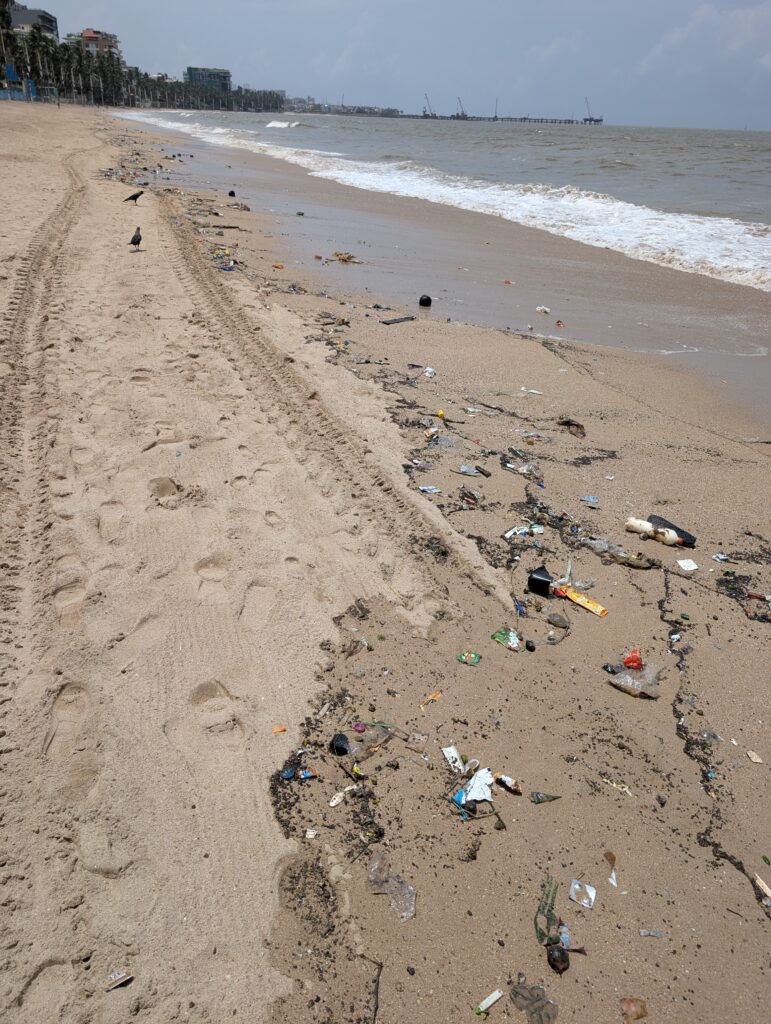 Suddenly, after about three hundred meters of winding through stacks of plastic bags and refuse, the road straightened out and entered an older, but very well kept street with shops, restaurants, and motels on the bottom levels. Another three hundred meters and I was among the very tall multi-level hotels and apartment buildings. Most of them looked quite nice on the outside. These hotels were right along the beach. I jogged over between them when I found an opportunity and walked along the beach. These nicer motels seem to have been designed to take advantage of the views, rather than direct beach access. Most of them had walls between their pools or courtyards and the beach. That made sense as I looked at the beach. The entire length of the beach was littered with trash washing up and floating back on the Arabian Sea’s tide.