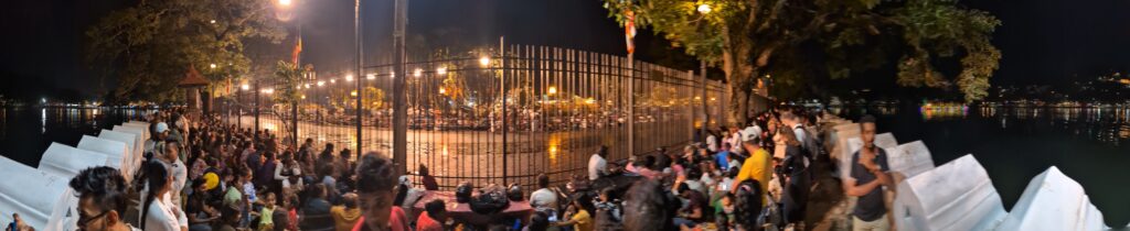 The policeman who had urged me away from the fence was trying to keep a narrow area behind the crowd seated on their blankets and the barrier clear for pedestrian traffic. The path was nevertheless quite narrow, and passers by as well as vendors often bumped and jostled me as I stood there for hours awaiting the parade I had come to Kandy particularly to see. The wait was long and uncomfortable. I had guessed incorrectly that I would find a place to get a meal while I waited. The peanuts wore off long before the procession arrived. I always enjoy people watching, though, and that was interesting. As always, I was somewhat of a spectacle to the vertically impaired South Asian spectators. Children stared, but responded joyfully when I interacted with them a bit, or shared a peanut or two. As darkness fell, the lights around the lake made a pretty sight. I bent over and stretched, moving my legs around to keep from stiffening up too badly.