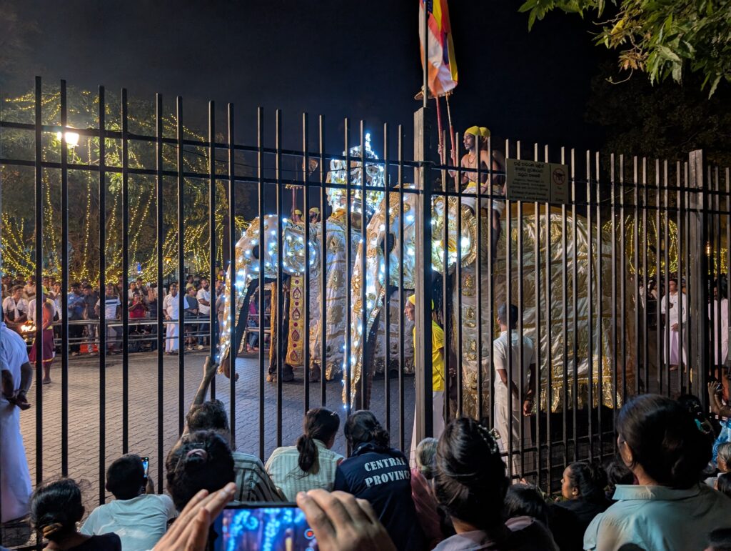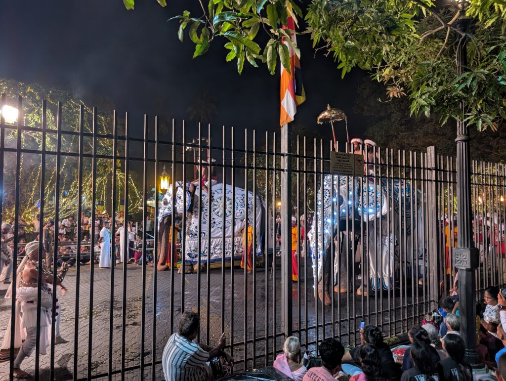 One elephant each in a couple of the groups of elephants that passed in the middle of the procession had a small structure at the peak of his back. The structure was shaped like a small, glitter colored, bedazzled veranda. One of these mounted carriages contained a tiny box supposed to contain the tooth relic itself. As I understand it, they do not risk displaying the actual tooth relic, but rather a replica. From any distance at all, you couldn’t see anything so small as a tooth. You really couldn’t even see the small box containing the replica tooth relic. From observing the folks around me, I gathered that the passing elephant was carrying the tooth relic platform. I’m not sure how anyone would ever know if there was an actual tooth in it.