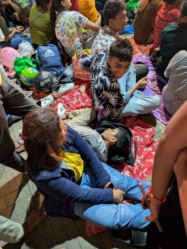 A three foot concrete barrier prevented people walking the lake shore from falling into the water. I leaned up against this to relieve the stiffness from standing after a couple of hours. A security officer charged with patrolling the event came by and told me I was not allowed to lean against this wall, but that for only $100, I could have a seat in the foreigners’ grandstand. I demurred and went back to standing. A light rain began to fall. This did not deter the crowds at all. Vendors came along selling tiny shelled peanuts that were pretty hard to eat and fairly bitter. I was hungry, though, and paid eighty or a hundred rupees for a sack (about thirty cents). Other vendors came along selling different items, some of which I could not identify. Some sold toys or amusements for the multitude of tiring children who had joined their parents to observe the spectacle.
