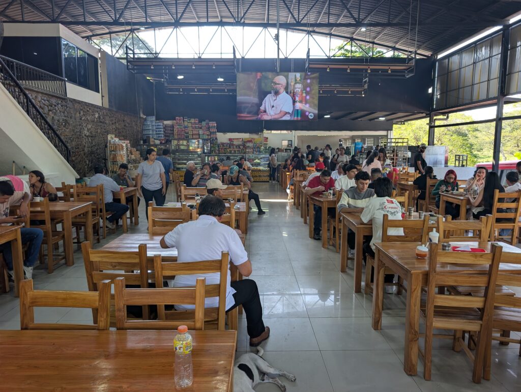 We heard a message entitled, “What Will You Do With the Word of God?” I was able to understand most of it, and of course, to participate in the singing and the Lord’s Supper. We were welcomed warmly, and also noticed that the congregation was celebrating the birthday of a former preacher who had served the Barranquilla congregation for over 50 years. He turned 84. We met many nice friends there and enjoyed coffee and an empanada with the brothers upstairs. We joined the Marin extended family for lunch at El Rancherito, a restaurant serving many local specialties. Andrew had another crack at Bandeja Paisa, and I tried a Cazuela. Cazuela is named after the ceramic bowl used in cooking, and can have various components based on locale. Aelen told me this was a very common dish, and I had already had Bandeja Paisa, so I decided to give it a shot. It was kind of like a stew made from beans, meat floss, chicharron, avocado, rice, potatoes, and arepa. I liked it. I tried some morcilla from Andrew’s plate. That was a blood sausage that was pretty good. Aelen also suggested we try some mondongo, a soup made from diced beef tripe. The texture was a bit unfamiliar, but the flavor may have been the best of all the foods we tried that day.
