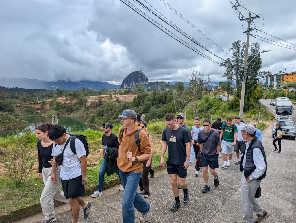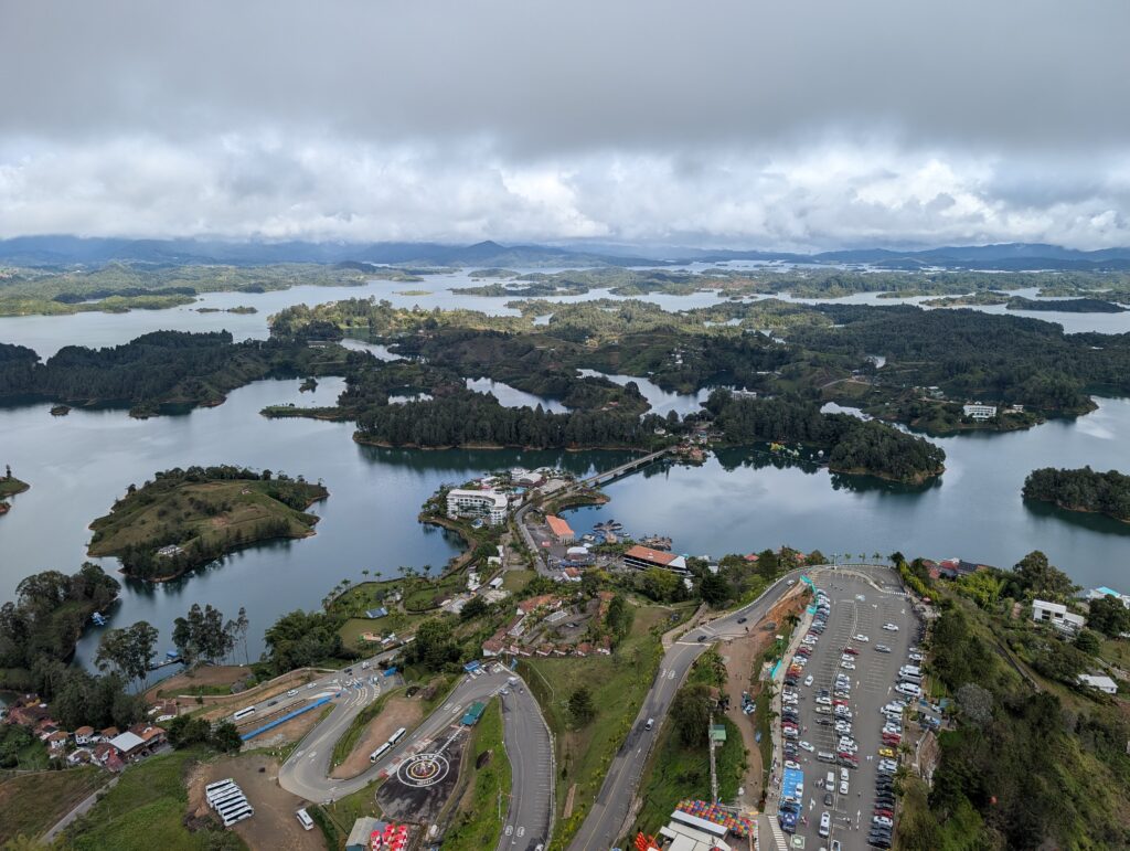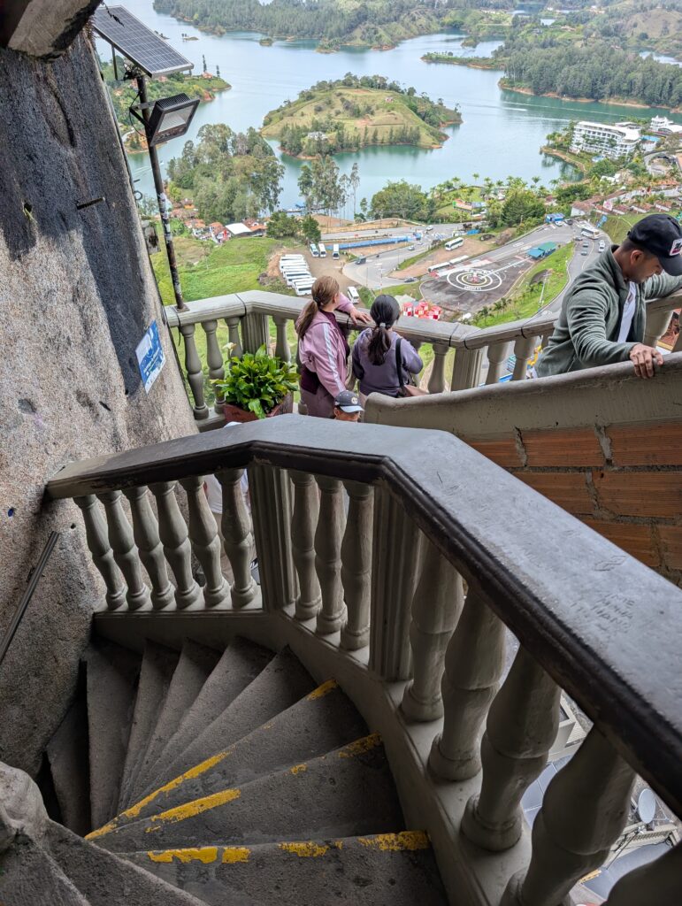I did not run on Tuesday the sixth, because we had a big day planned with a relatively early start. This marked the beginning of a gap of about a week in my run schedule. I normally do not like to take guided tours. When I do, it is usually because the logistics and costs of transportation are about equal, making the tour essentially free. In this case, we probably saved money by taking the guided tour over the compendium of buses, rickshaws, and meals we would have had to buy in place of the tour. Our tour took us to Guatape, with the highlight being the Piedra de Penol, a huge igneous boulder with stairs carved into the side that overlooks a massive reservoir.