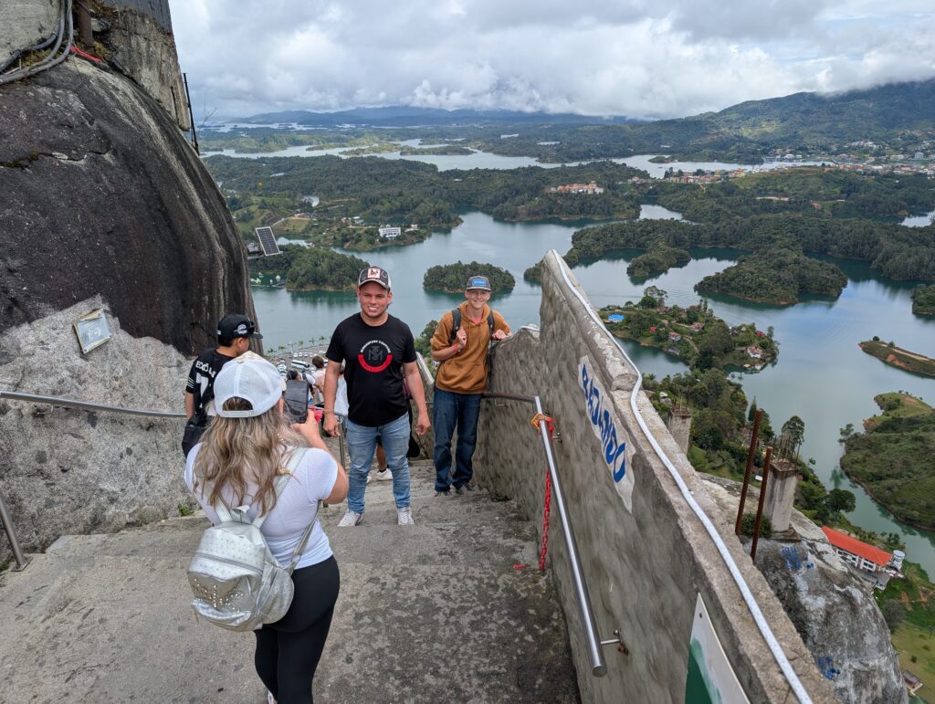 Before arriving at the Piedra, however, we ate a light, included breakfast. As always, Andrew enjoyed visiting with our travel companions. In this case, we spent a long time talking with a group of Danish fellows out seeing the world together. He got some more advice about visiting Scandinavia while we munched on eggs, mango, and an arepa. This was enough fuel to get us up the boulder. Andrew was nervous about not having enough time on top of the rock, so I obliged him by scampering up the 730-some steps at a brisk enough pace to put me in a good sweat. This did allow us more than enough time to get all of the pictures we wanted, and to enjoy the view. It is a spectacular view. We drank in the scenery, did a bit of people watching, and ultimately bypassed the souvenir and trinket shops.