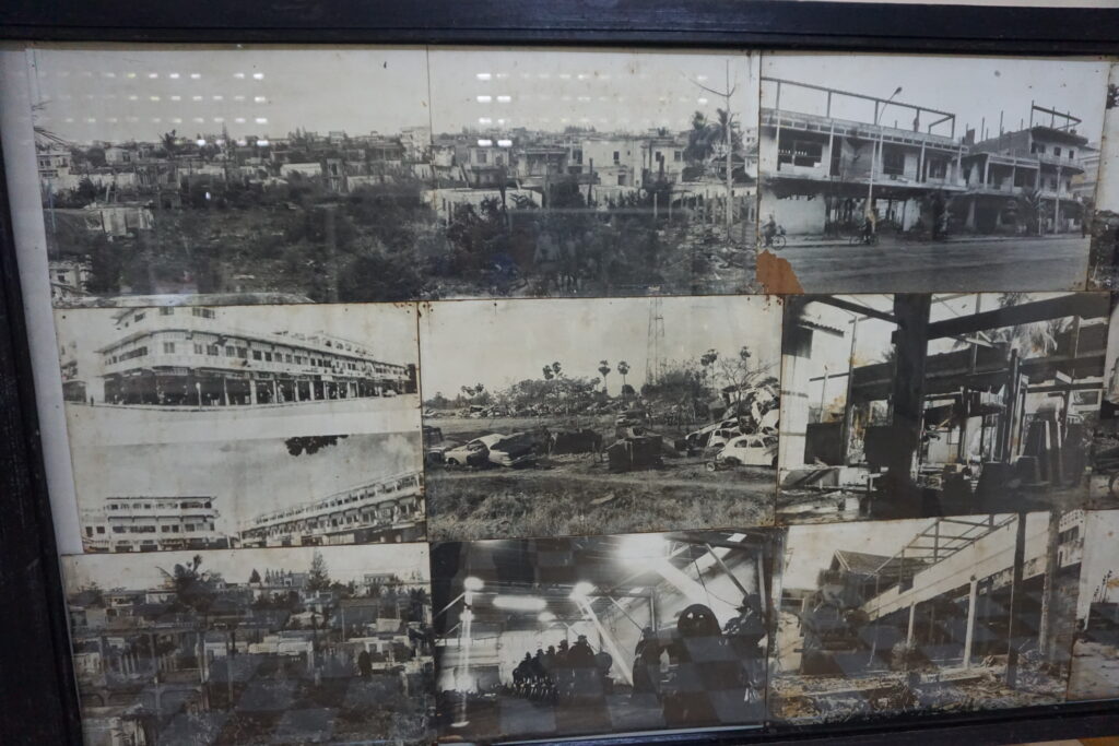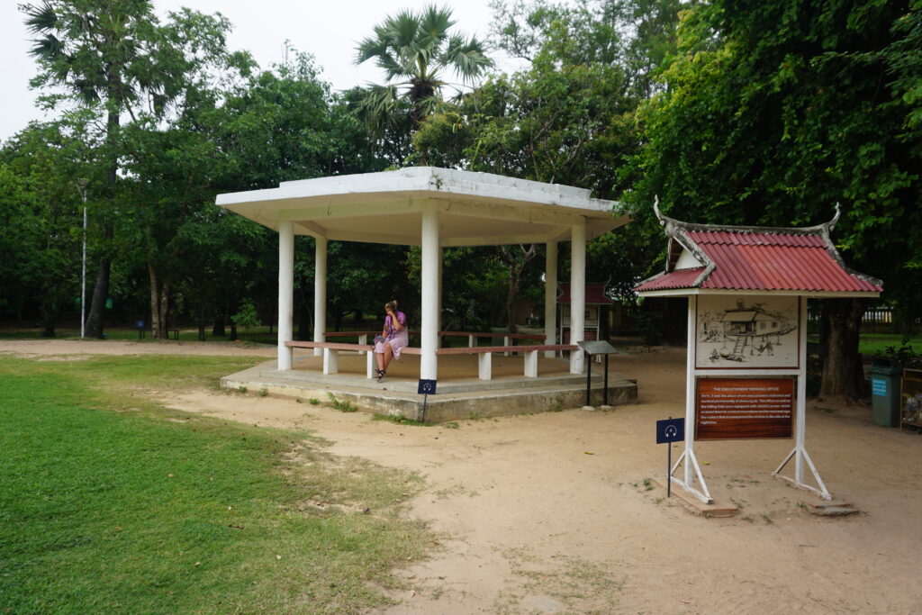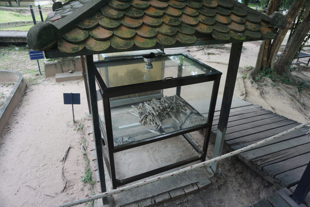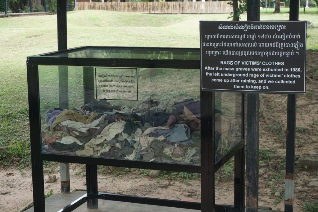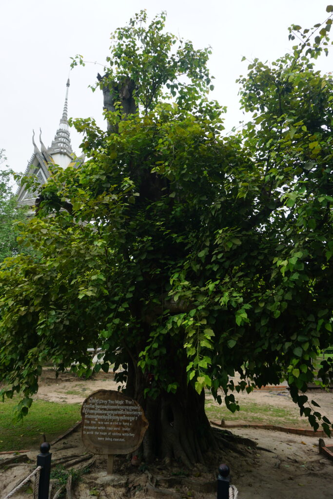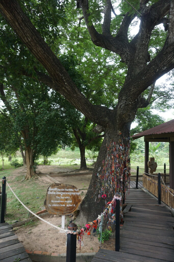 During seasons of heavy rain, bone and clothing fragments still often surface. The Buddhist caretakers of the site periodically walk the grounds and collect them. Here and there are boxes with some of these fragments. You can also see a killing tree used to dispatch babies and small children. It is decorated with memorials to the babies and toddlers murdered there. When the site was first discovered in the spring of 1979, the first people entering the camp found the tree caked with the blood, brains, and hair of those who lost their lives there.