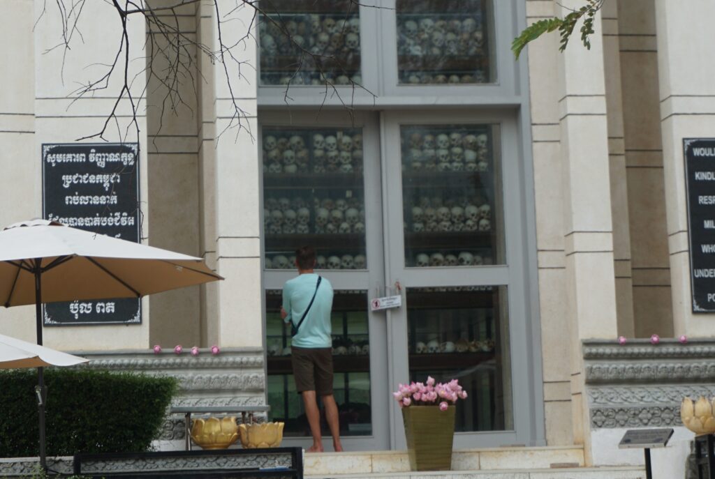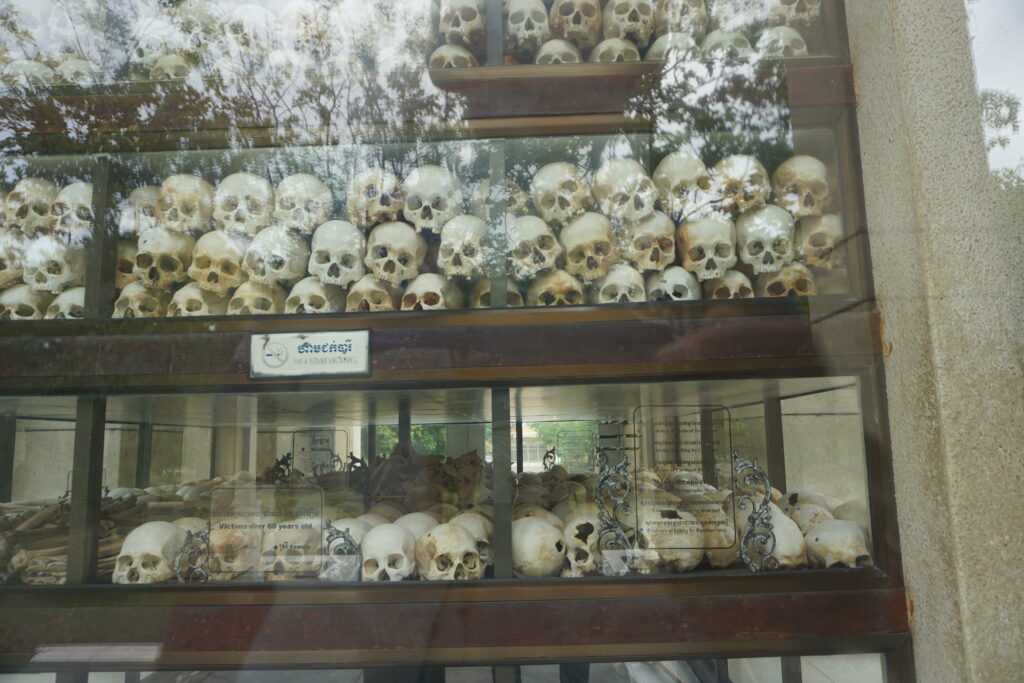 My daughter, Audrey, often comments with revulsion at the macabre practice common in some parts of Europe and Latin America of displaying human remains. I have to say that I, too, was taken aback at seeing Francisco Pizarro’s skeleton complete with bashed skull on display in a glass box in the cathedral in Lima, Peru. Human remains are very much a part of the memorial at Choeung Ek, but it does not seem inappropriate and certainly does not come across as something to attract gawkers like the catacombs in Europe sometimes do. For one thing, ancestor veneration is deeply important to Buddhists. As such, it is not uncommon for human remains to be kept and even worshiped. That cultural aspect plays a role in how human bones are used at Choeung Ek.