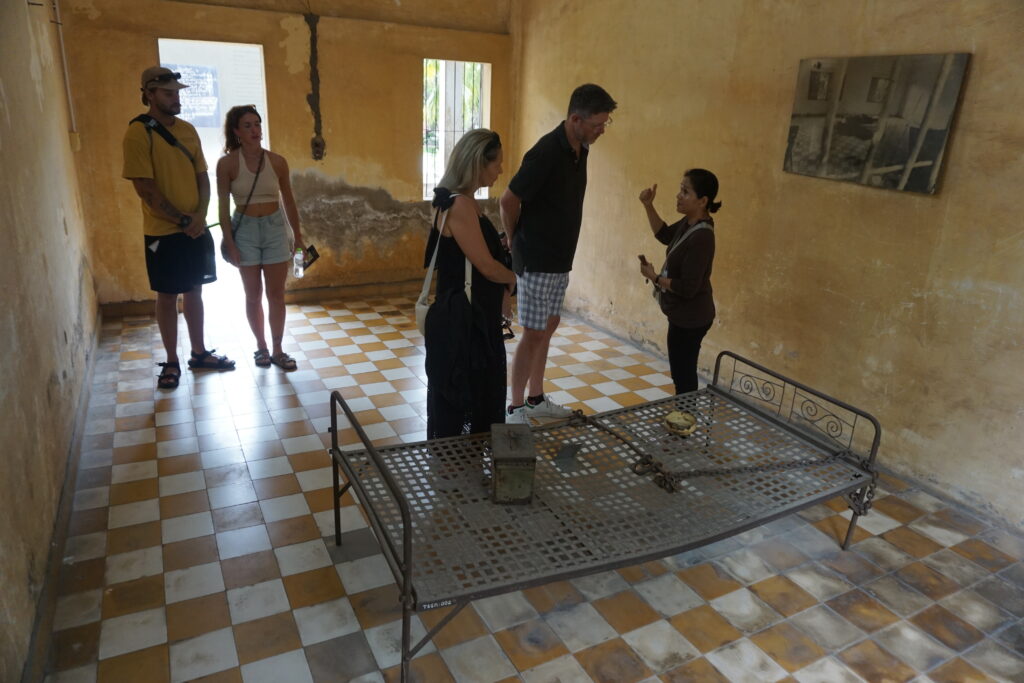 As I tried to put my boots back on to leave the stupa, it came over me like a wave. I covered my face with what had been my sweat mop, and I cried aloud. Then I sobbed. Then I cried some more. It is almost beyond imagination to try to understand how and why people do the things they sometimes have done to other people. My next stop was slated to be a torture chamber that only precluded the horrors done here – where victims had no hope of escape, and where their resistance to confession to fictitious crimes only prolonged their agony.
