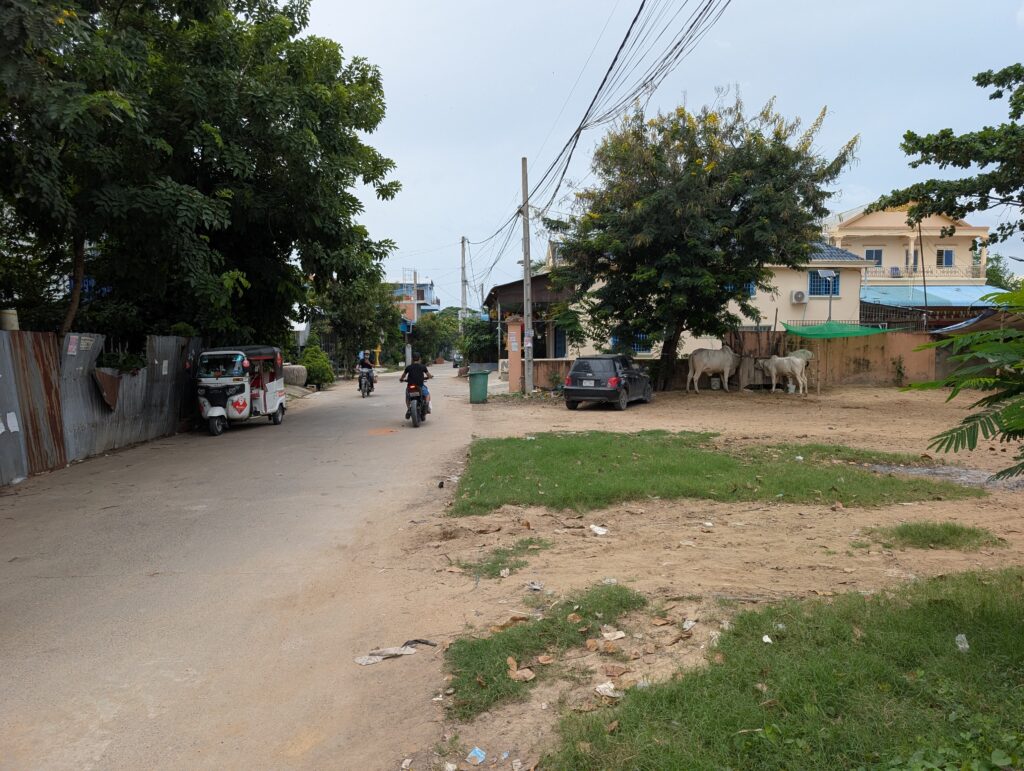 I was able to navigate the city bus system, which got me within a few hundred meters of my room, then walked the rest of the way to Vanny’s Peaceful Guest House, where I had reserved a room with a private bath. The air conditioner on the city bus was cranking nicely, so I cooled down some en route. My room, too, was less than what the advertising led me to expect. I was staying in a hostel. I did have my own room, which I locked by stringing a padlock through two eye bolts. My private bathroom was outside of my room, and was only private in the sense that no one else was staying on my floor to use it. The air conditioner only cooled the room down after a couple of hours. I adjusted to this by taking a cold shower each time I returned to the room and let the fan blow on my wet body until the air conditioner had had time to adjust the temperature. All of that was acceptable I suppose, considering the room cost me $12 per night. The problem is that during the off season, if you look hard enough, $12 a night can buy you a real motel room in Phnom Penh with cranking AC, a private bath, and a pool. Vanny was a kind host, though. I think I could have stayed here for less than half the price and had the same experience just by taking a hostel bed.