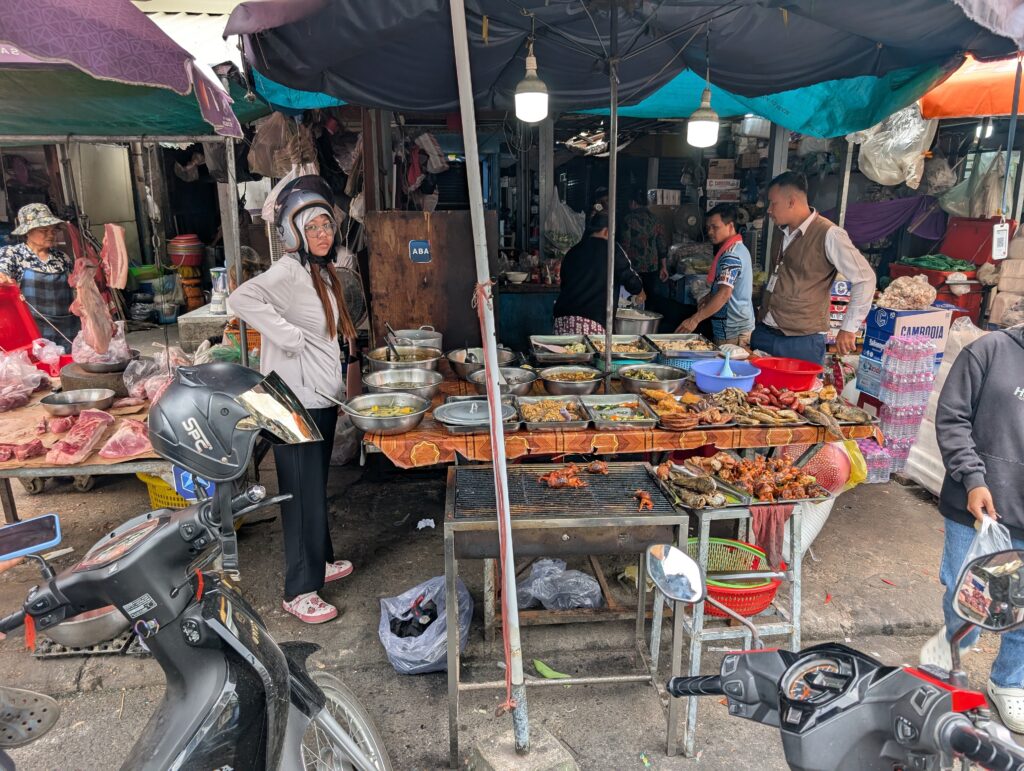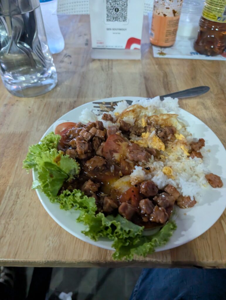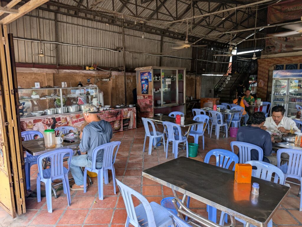 I had originally planned to stop and eat lunch at a cooking school that takes orphans living in and around the Phnom Penh dump and gives them a usable skill. From what I understand, visitors can buy lunch there, thus supporting this useful cause. It seemed like a nice way to break up the emotional weight of an extremely heavy day. Sadly, I learned that the place was closed on Saturdays. I resorted to an old West Texas trick. In Texas, if you don’t know where you should stop and eat, it’s a good bet that whatever place has the most pickup trucks parked outside will probably have good food. I adjusted this a bit and used the ubiquitous motorbikes as my guide. I figured if all of the motorbike taxi drivers and other locals were eating at one of those open air food joints, it must be pretty good. If I was wrong, at least the food would be fresh from the high turnover rate. My guess proved right and I had a tasty, inexpensive lunch.