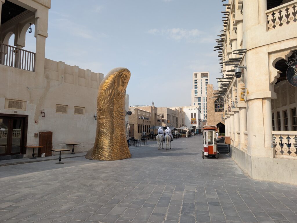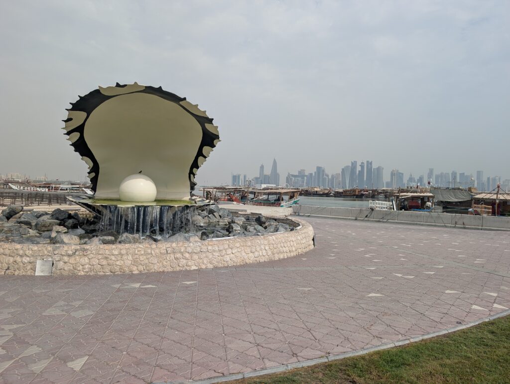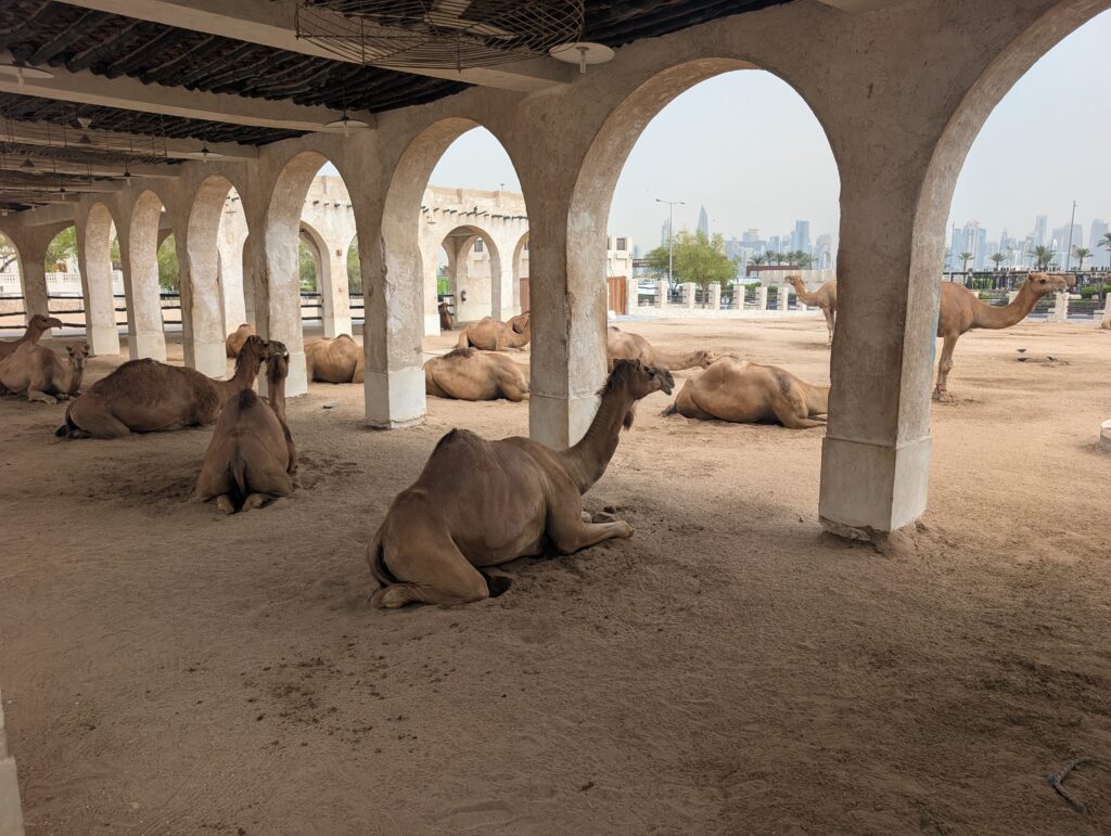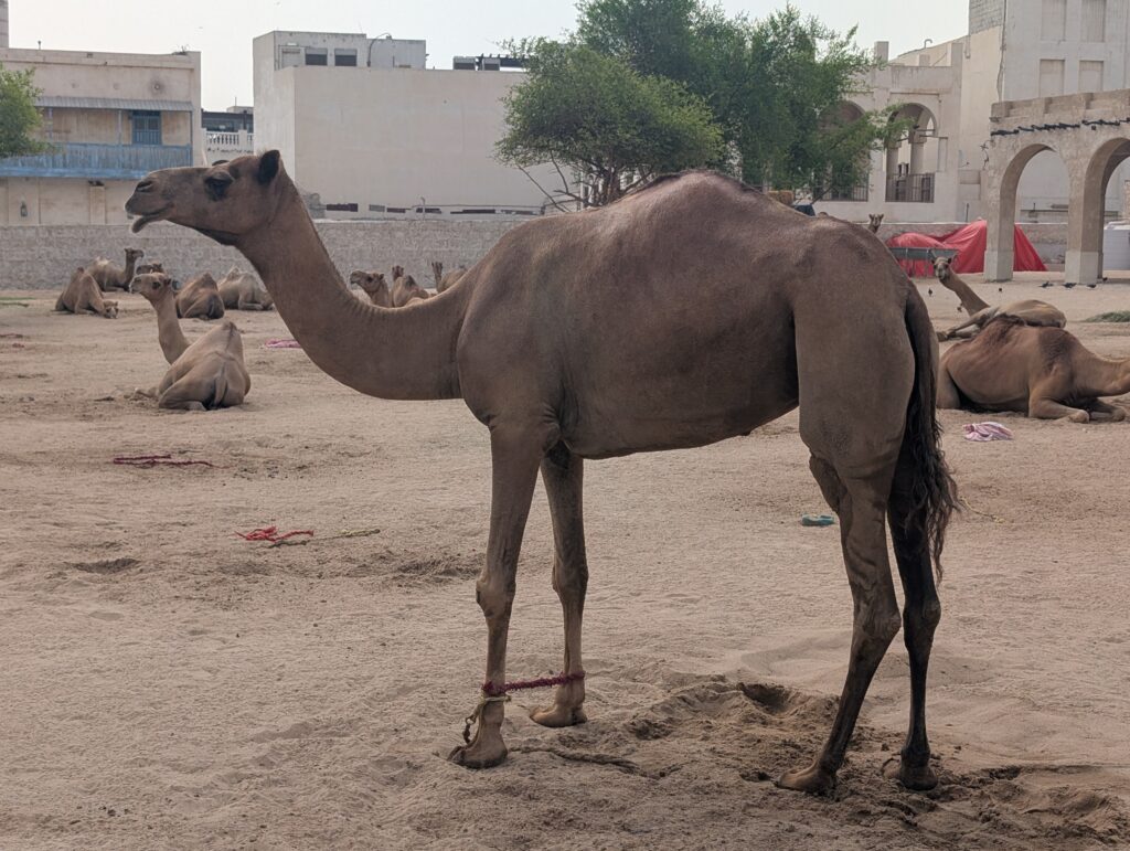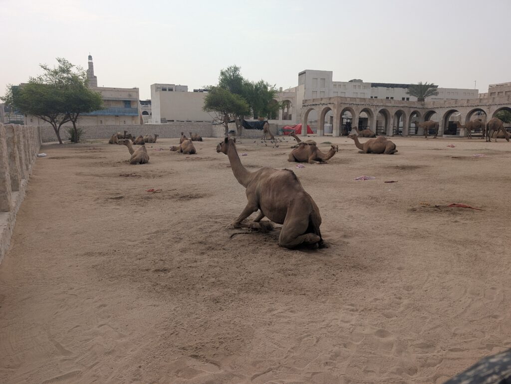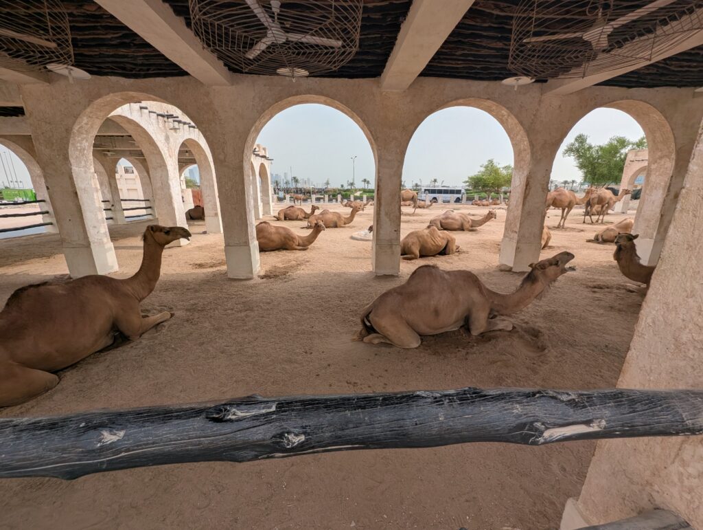 Early the next morning, I headed back toward Souq Waqif. As was the case in Bahrain, the souq was pretty dead early in the morning. It was interesting to see mounted law enforcement riding between shops and restaurants, but there wasn’t much commercial activity. I found a peculiar giant “golden thumb” statue marked as a tourist attraction. Not being all that impressed by this, I continued to the camel and horse stables. I didn’t find any horses, but a few dozen friendly camels were lounging in a pen along one side of the souq. The place was deserted at that hour, so I walked the perimeter of the pen, taking pictures and scratching camels, keeping an eye out for any potential spitters. Not far away stands a large, clam and pearl monument to the pearling industry. Nearby are some later model Arabic dhow style boats. I assume one can hire a cruise on these during the cooler season, but that did not seem to be an option when I was there. Apparently, in busier times you can even see the camels race at a nearby track.