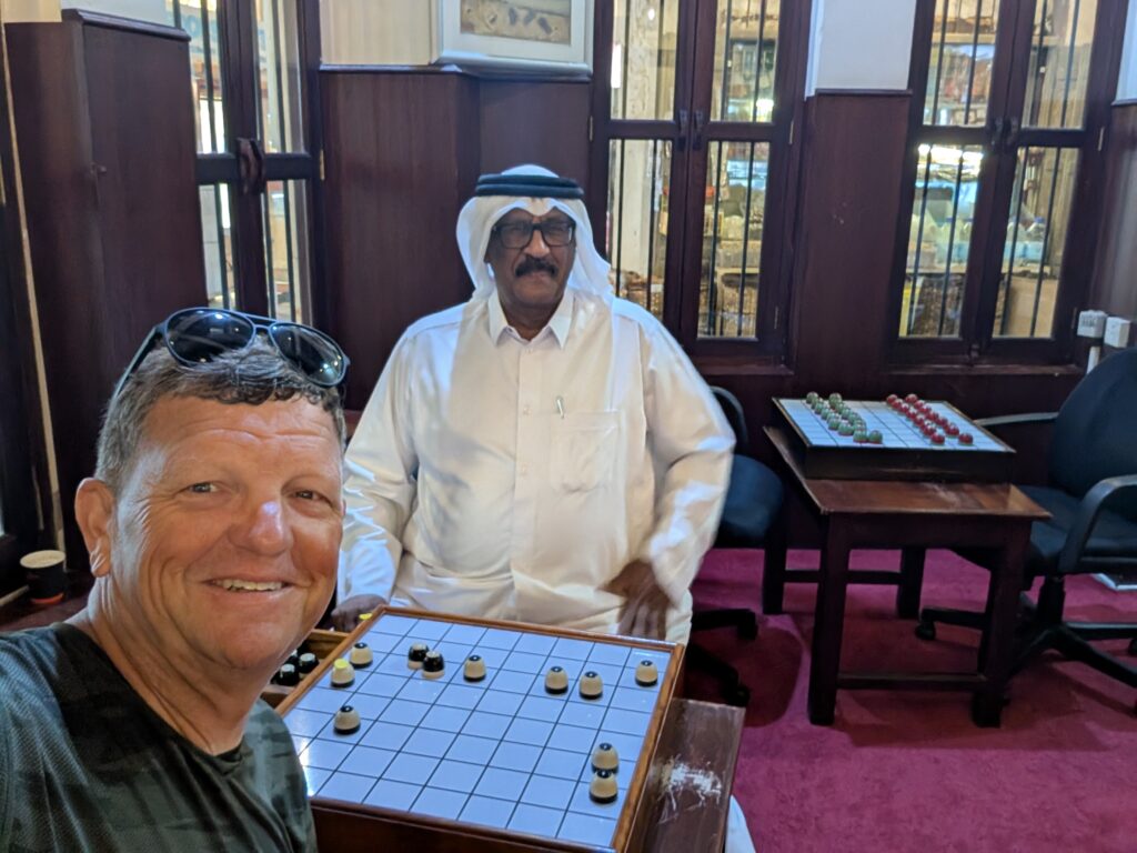 Before long, I was invited in by an English speaking former Qatari Air Force maintenance supervisor named Khalid. He was the only actual Qatari I met the entire time I was in Qatar. Khalid was a congenial older fellow. We chatted as he taught me the basics of Dama. I was able to deduce some of the basic strategy, and strung the game out for a while before succumbing. I was being introduced to the rules and piece movements as the game went along. Eventually, a fissure developed in the dam I had created with my pieces. My new friend Khalid broke through, and shortly thereafter the dam burst. I was soundly defeated. It was a fun interaction. This was the kind of personal experience I enjoyed more than looking at pearl monuments or peculiar mall architecture.