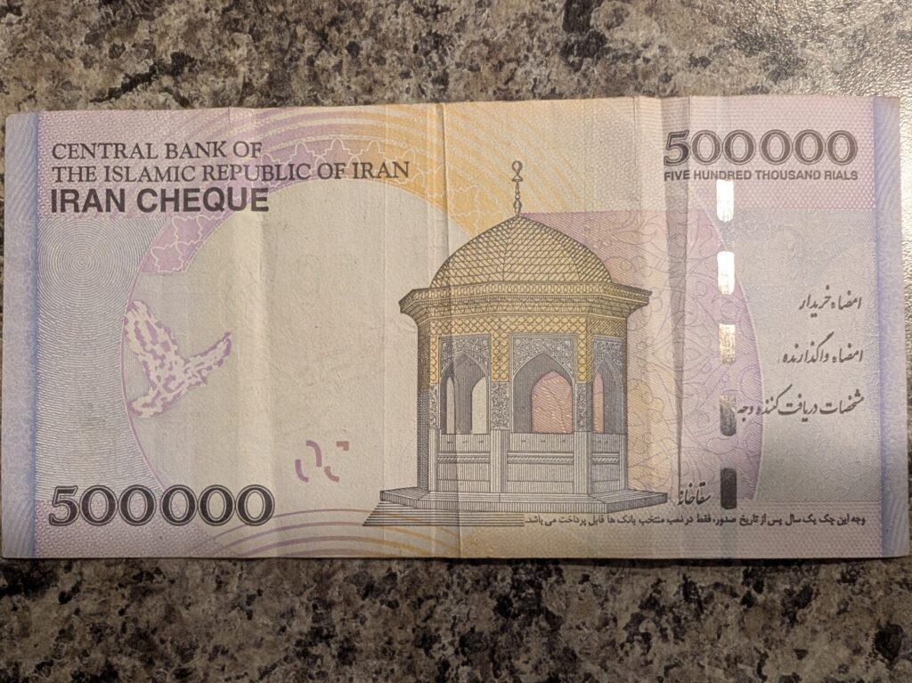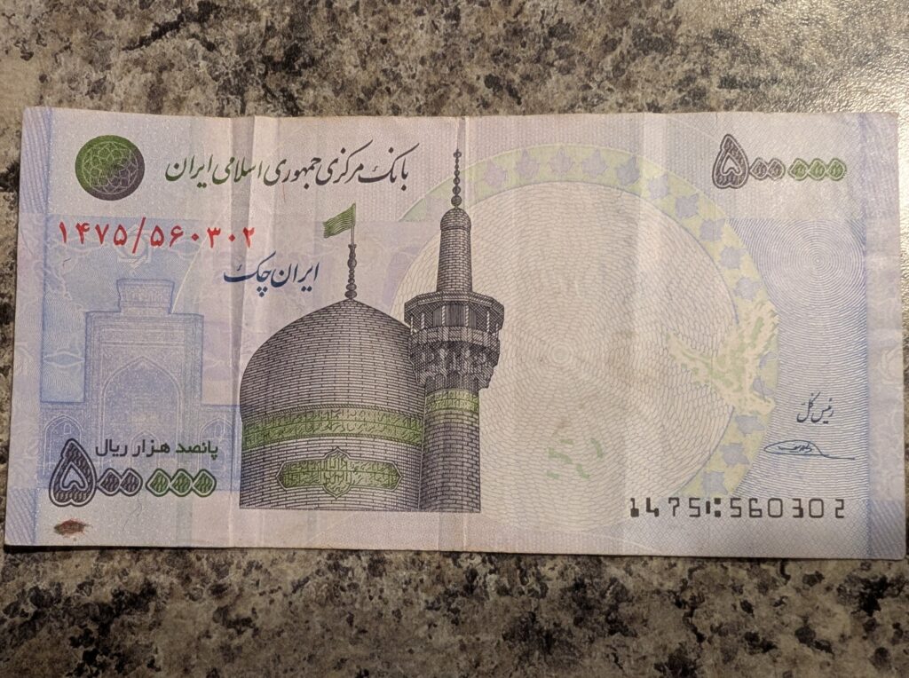 He responded with a friendly gesture, and hearty agreement. He opened his wallet and pulled out a 500,000 Iranian Rial note. I thought he was just showing it to me, but he meant it as a gift. I offered to trade him some Qatari or American currency for it.